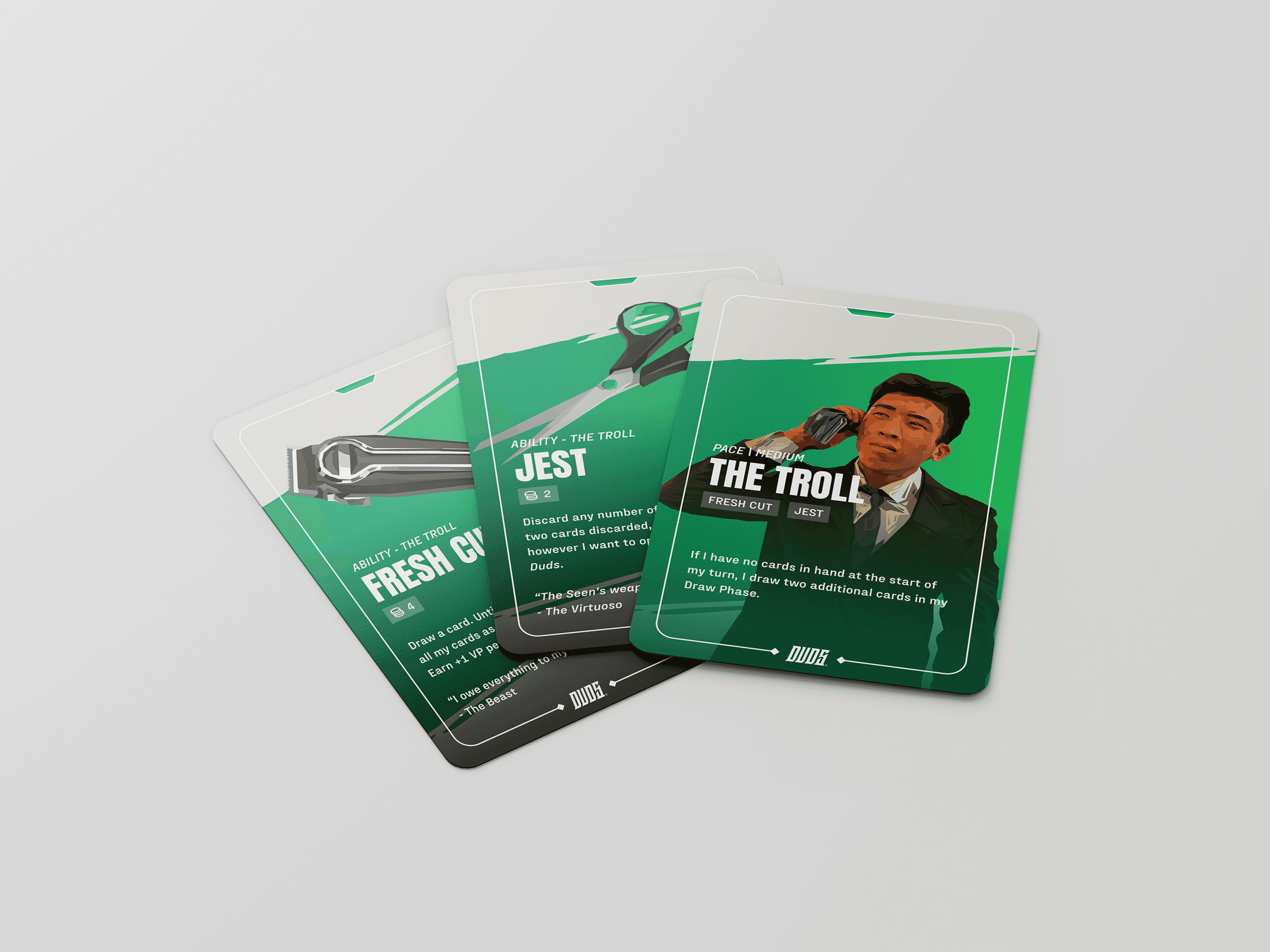 Duds was developed through constant playtesting with friends, focusing on how people actually behave around a table and not just how a game works on paper. From the start, the core goal was interactivity: designing mechanics that keep everyone involved even when it isn’t their turn, through reactive cards, shared Events, and even fun little cards that you could sneak onto other players. While staying true to familiar turn-based TCG structures, the game pushes players to stay present rather than disengaging between turns.