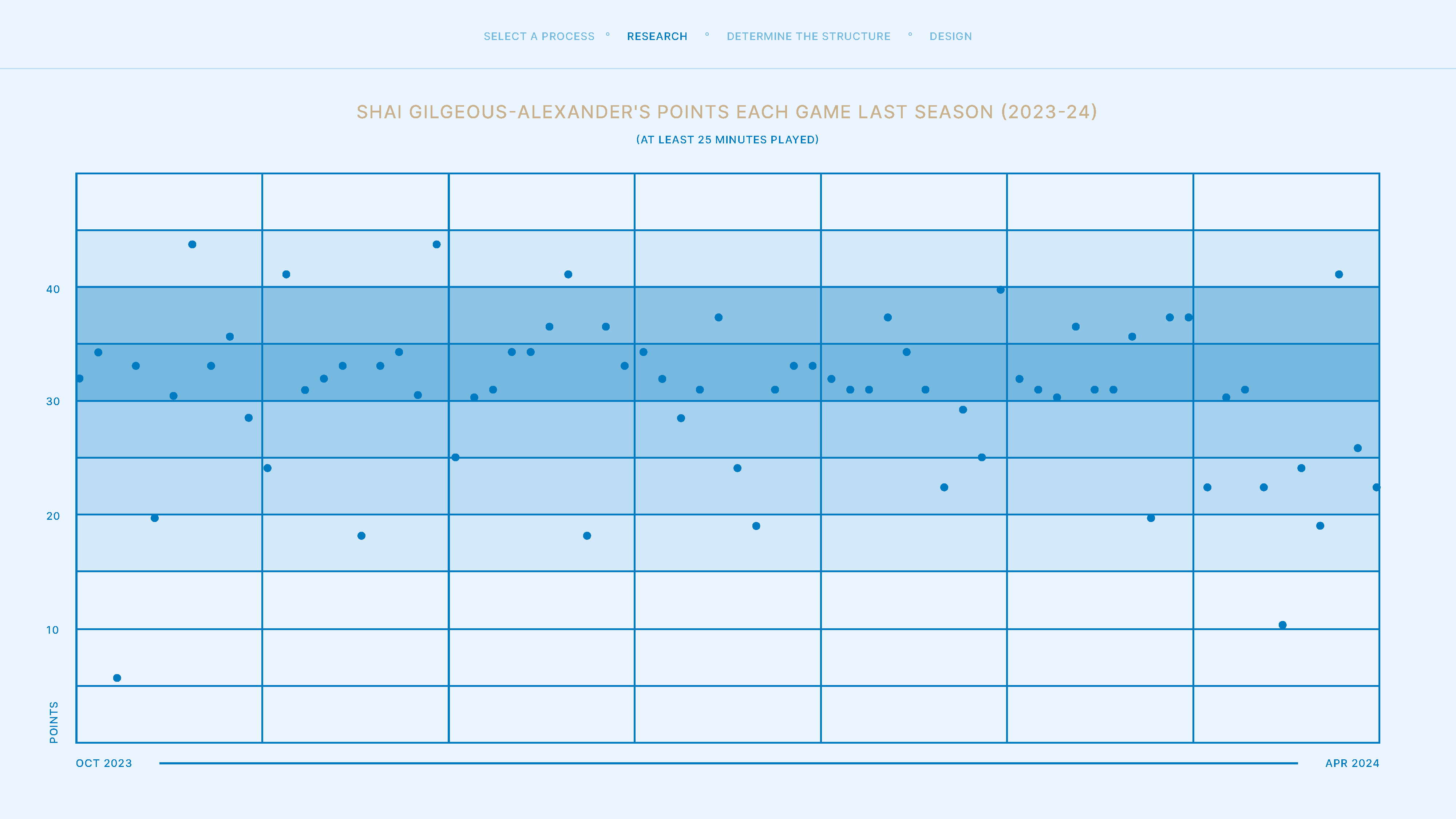This design effectively visualizes Shai Gilgeous-Alexander’s consistency using a structured and engaging layout. The court background and collage provide instant context, ensuring the audience immediately recognizes the subject. A variety of graphs highlight key statistics: