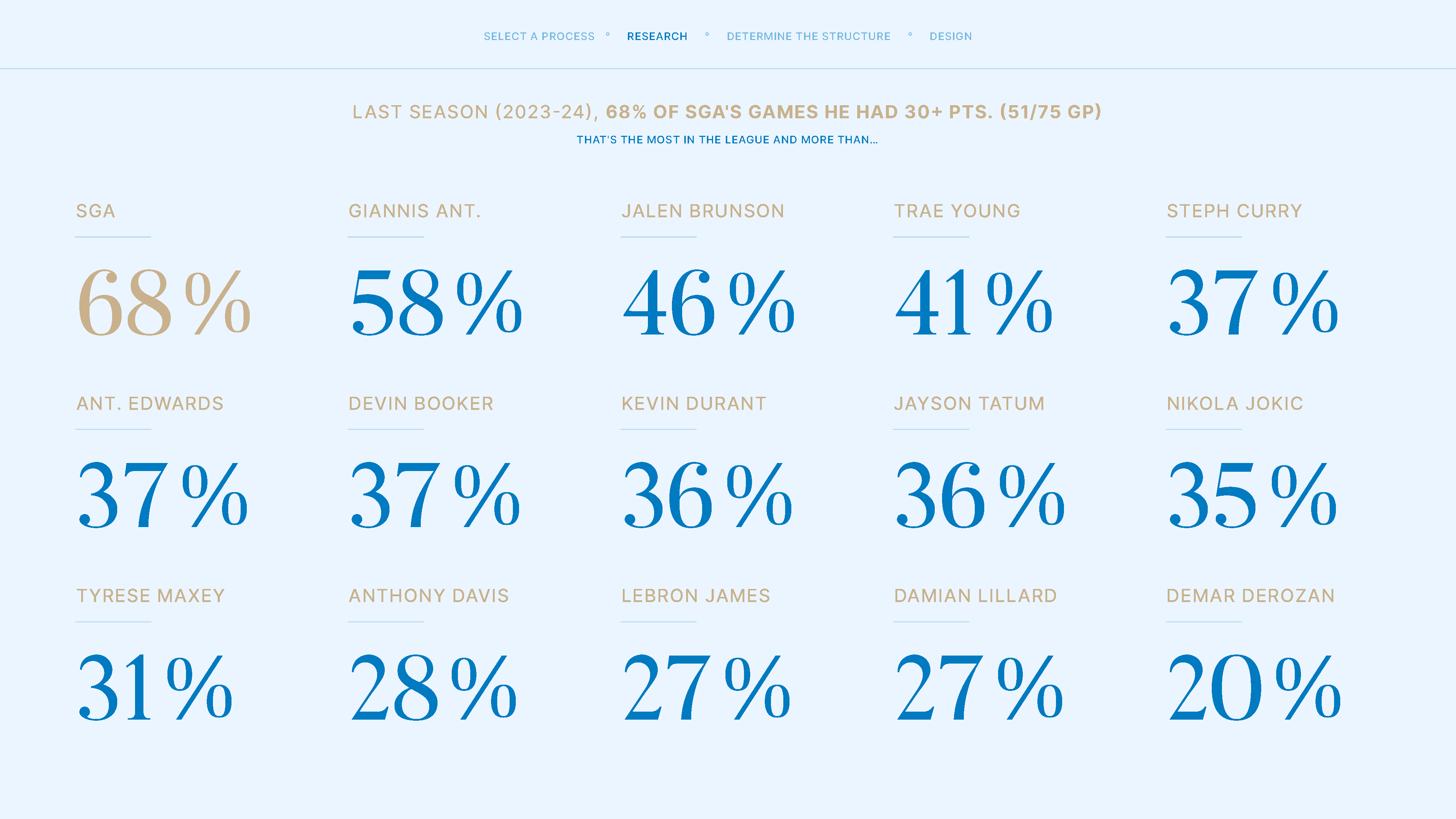 The poster explores Shai Gilgeous-Alexander’s consistency by breaking down both what he excels at and how he sustains it. Using repeated visual rhythms and data-driven emphasis, the design highlights his reliability in scoring, efficiency, and control of pace, showing consistency not just as a stat line but as a disciplined, repeatable approach to the game.