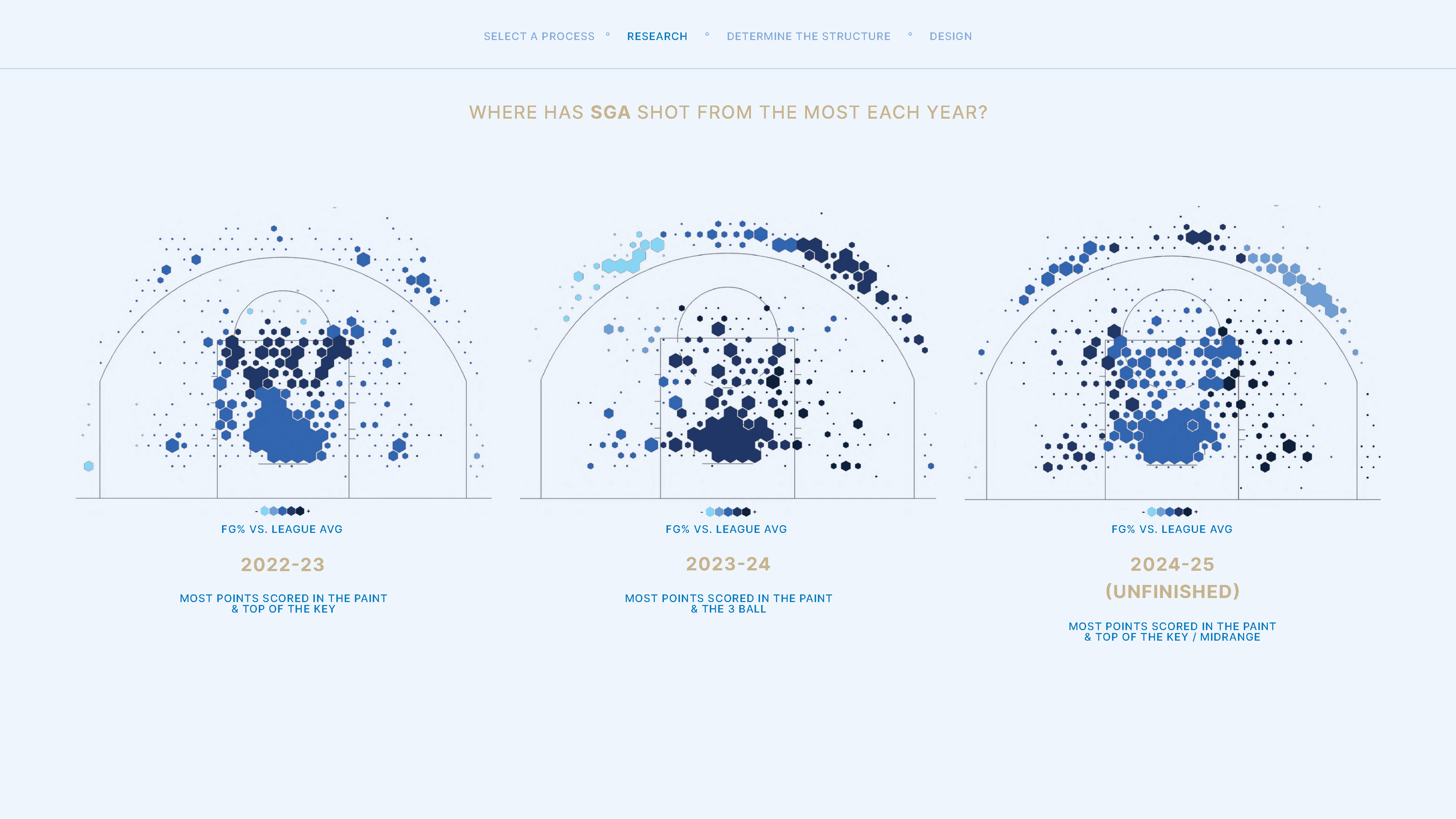 Heat Map: Shows how SGA gets to his spots and what spots on the court he's consistent from.